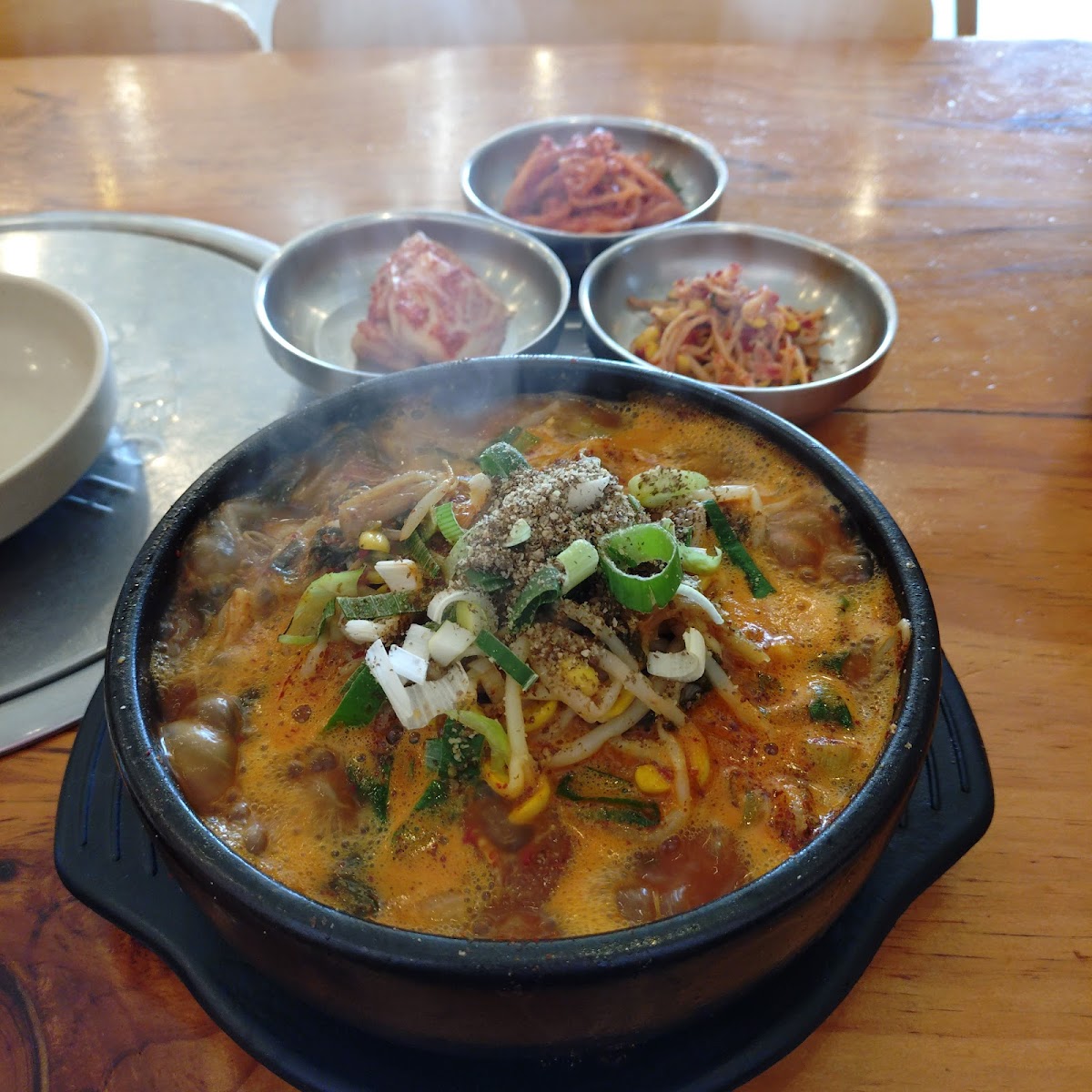 If you’re a fan of spicy comfort food, the 돼지김치찌개 (Kimchi Pork Stew) is a must-try. This dish is packed with flavor and comes with a good balance of spice and umami, thanks to the perfect mix of kimchi and tender pork. The soup is hearty, making it the ideal dish to warm you up on a chilly day. Paired with a bowl of steamed rice, it's the ultimate comfort meal.