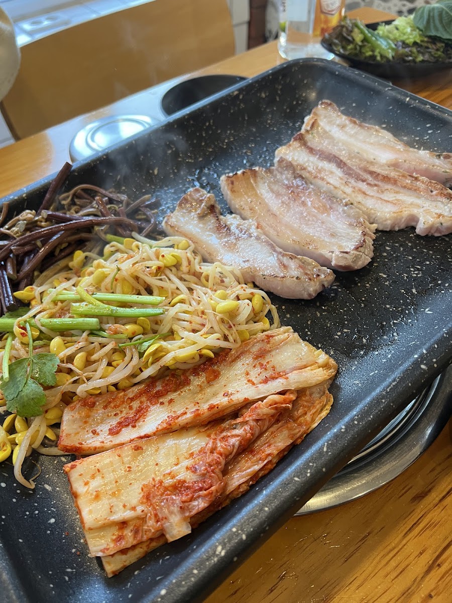 One of the standout dishes here is the 삼겹살 (Samgyeopsal), a savory grilled pork belly that’s perfect for sharing. The pork belly is grilled right at your table, allowing you to enjoy it fresh off the grill, crispy on the outside while remaining tender inside. Served with a variety of sides, including the ever-popular basic 찬 (banchan), it’s a classic that never disappoints.